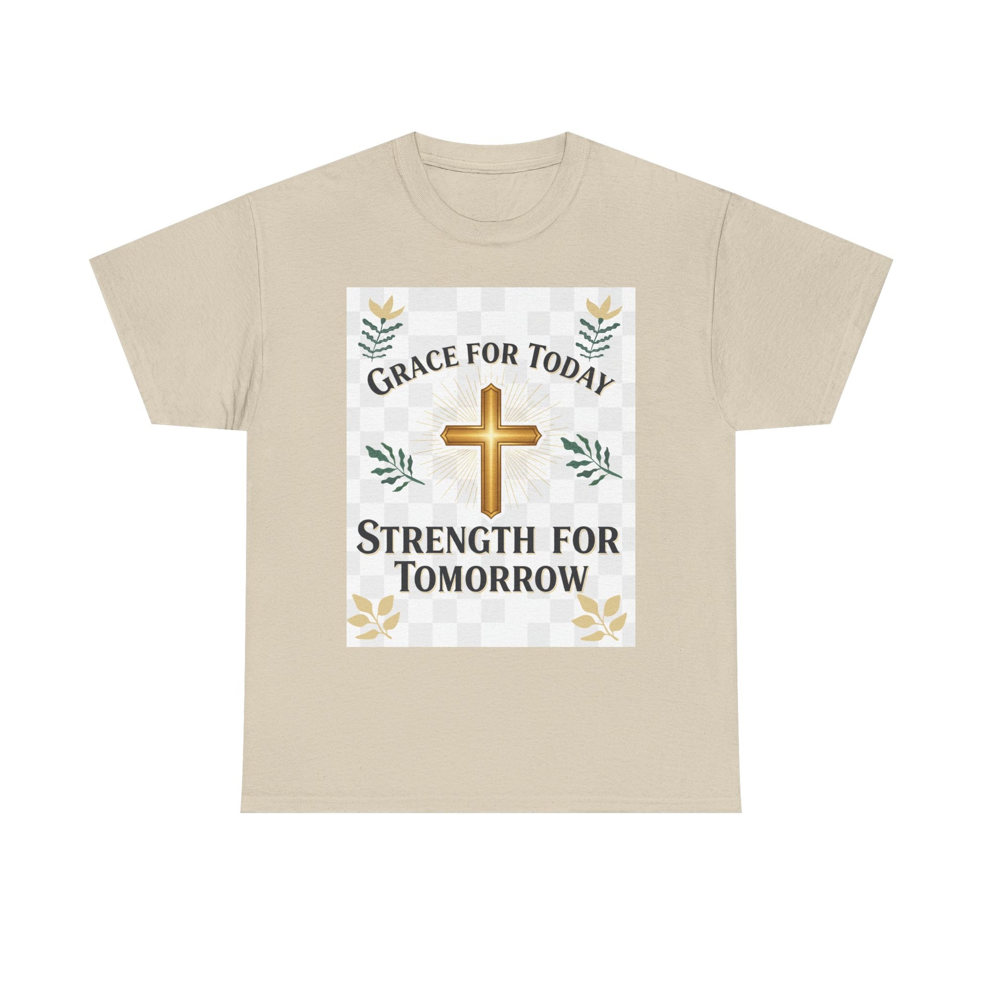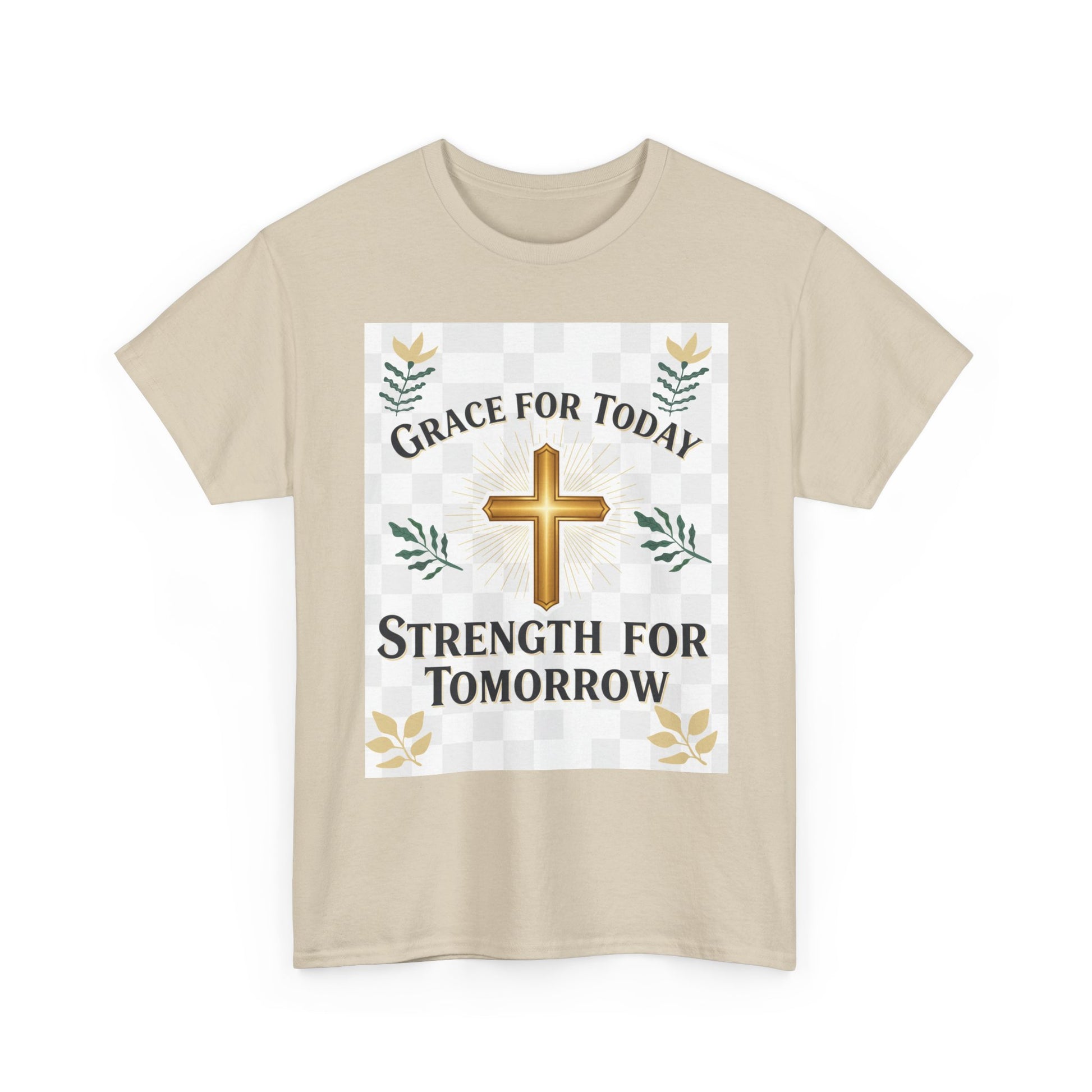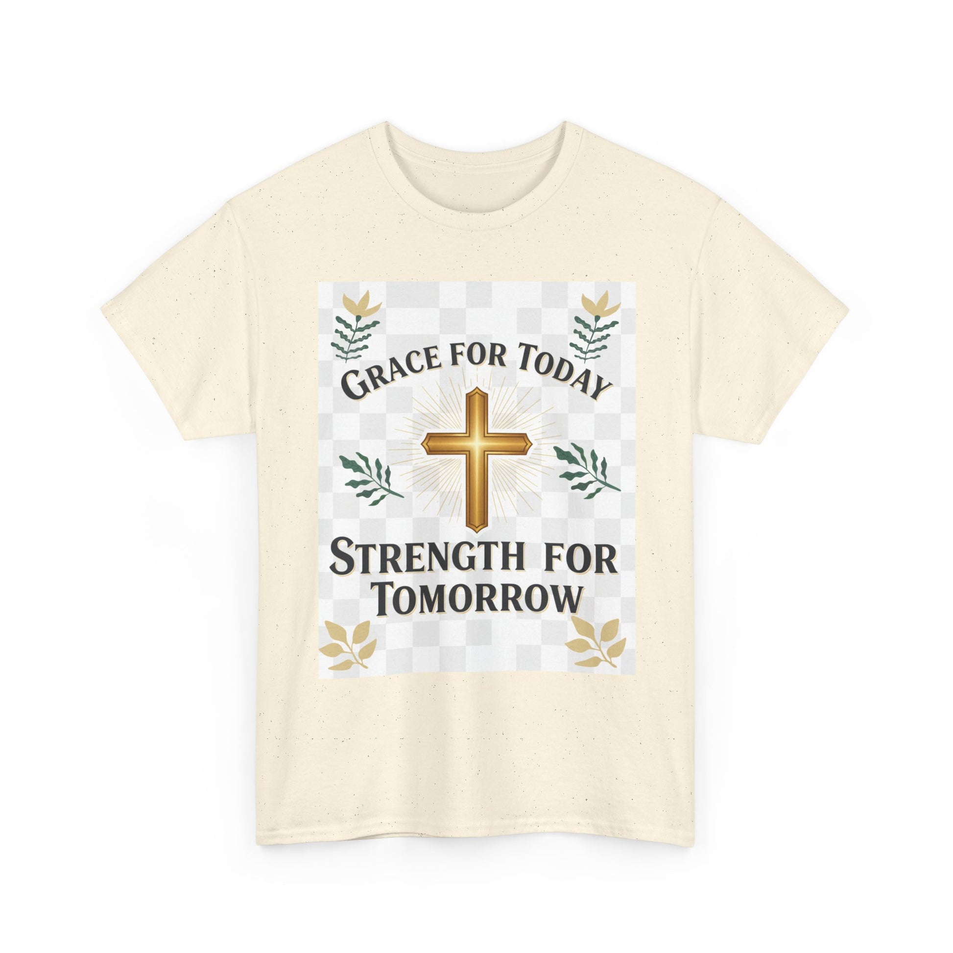 Soft, honest, and quietly confident — this classic crew tee speaks to morning prayers, steady faith, and small daily victories. A warm golden cross sits at the center, framed by gentle foliage and a subtle checker detail. The words “Grace for Today, Strength for Tomorrow” feel like a whispered promise you can wear: reassuring during quick coffee stops, Sunday routines, volunteer shifts, or slow afternoons at home. The relaxed cut lets the message come through without fuss. Wear it with jeans or layered under a cardigan; it settles into the rhythms of real life and holds up wash after wash.
