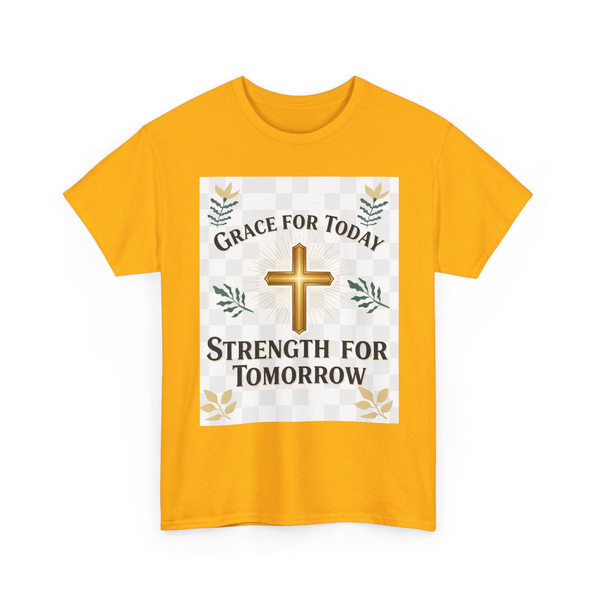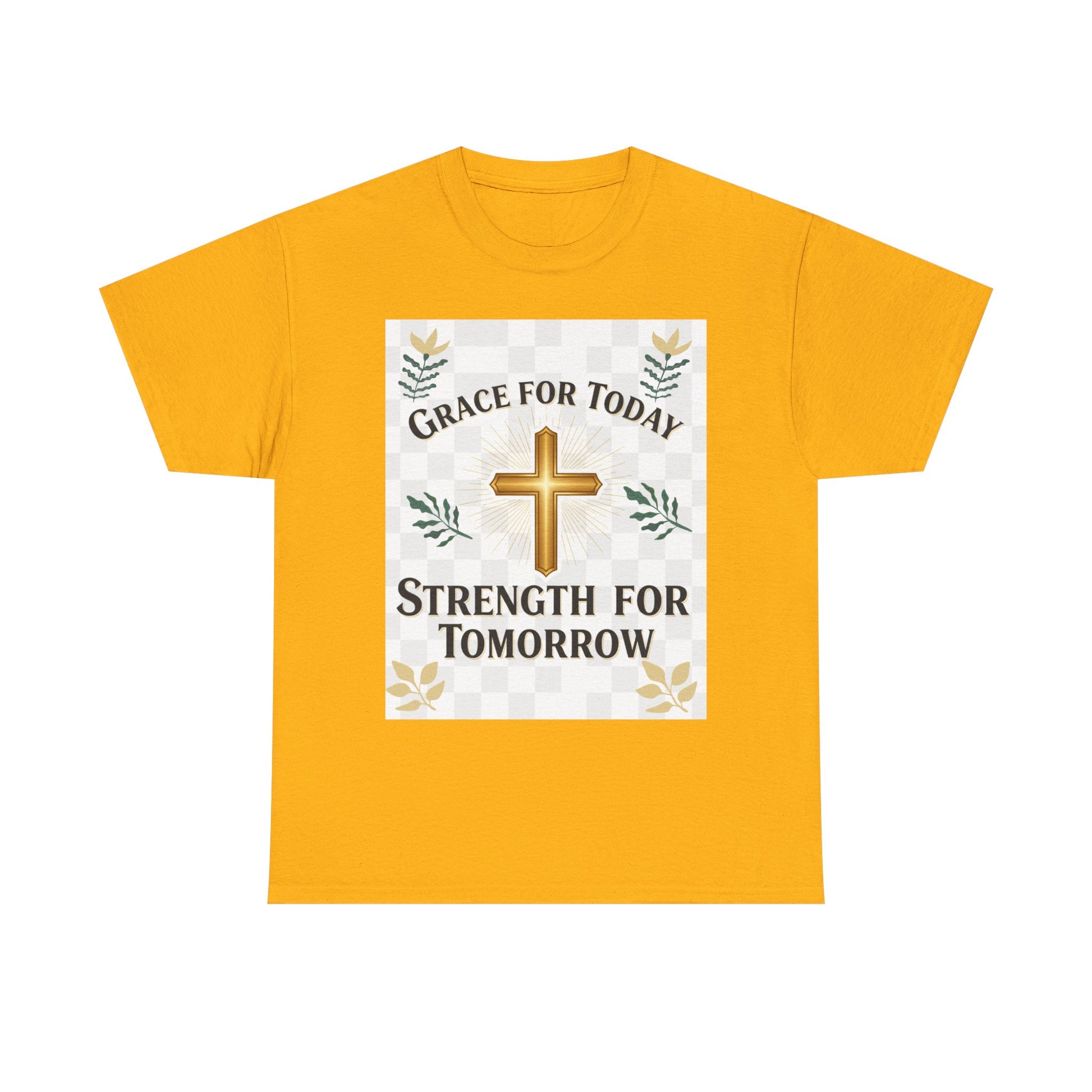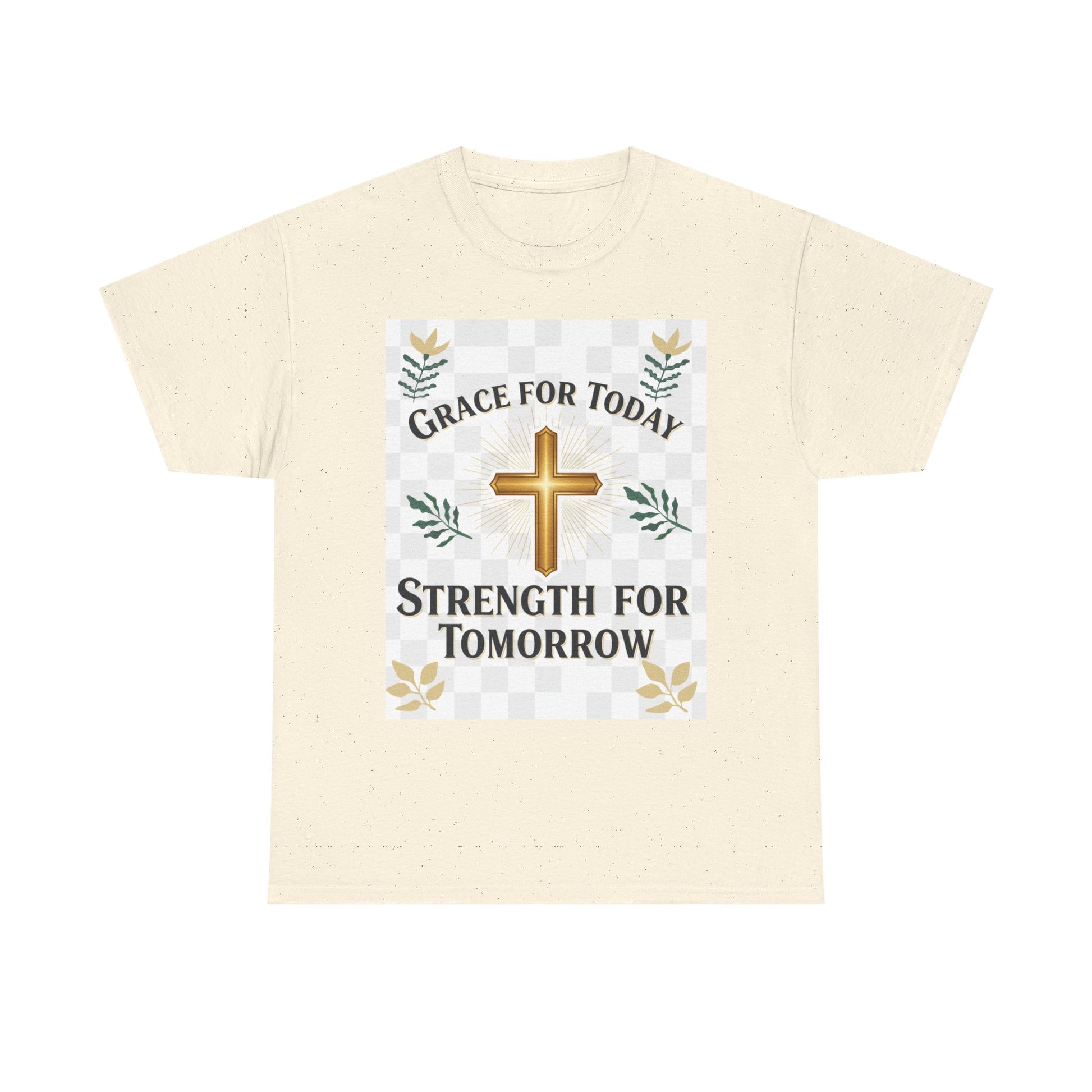 Soft, honest, and quietly confident — this classic crew tee speaks to morning prayers, steady faith, and small daily victories. A warm golden cross sits at the center, framed by gentle foliage and a subtle checker detail. The words “Grace for Today, Strength for Tomorrow” feel like a whispered promise you can wear: reassuring during quick coffee stops, Sunday routines, volunteer shifts, or slow afternoons at home. The relaxed cut lets the message come through without fuss. Wear it with jeans or layered under a cardigan; it settles into the rhythms of real life and holds up wash after wash.