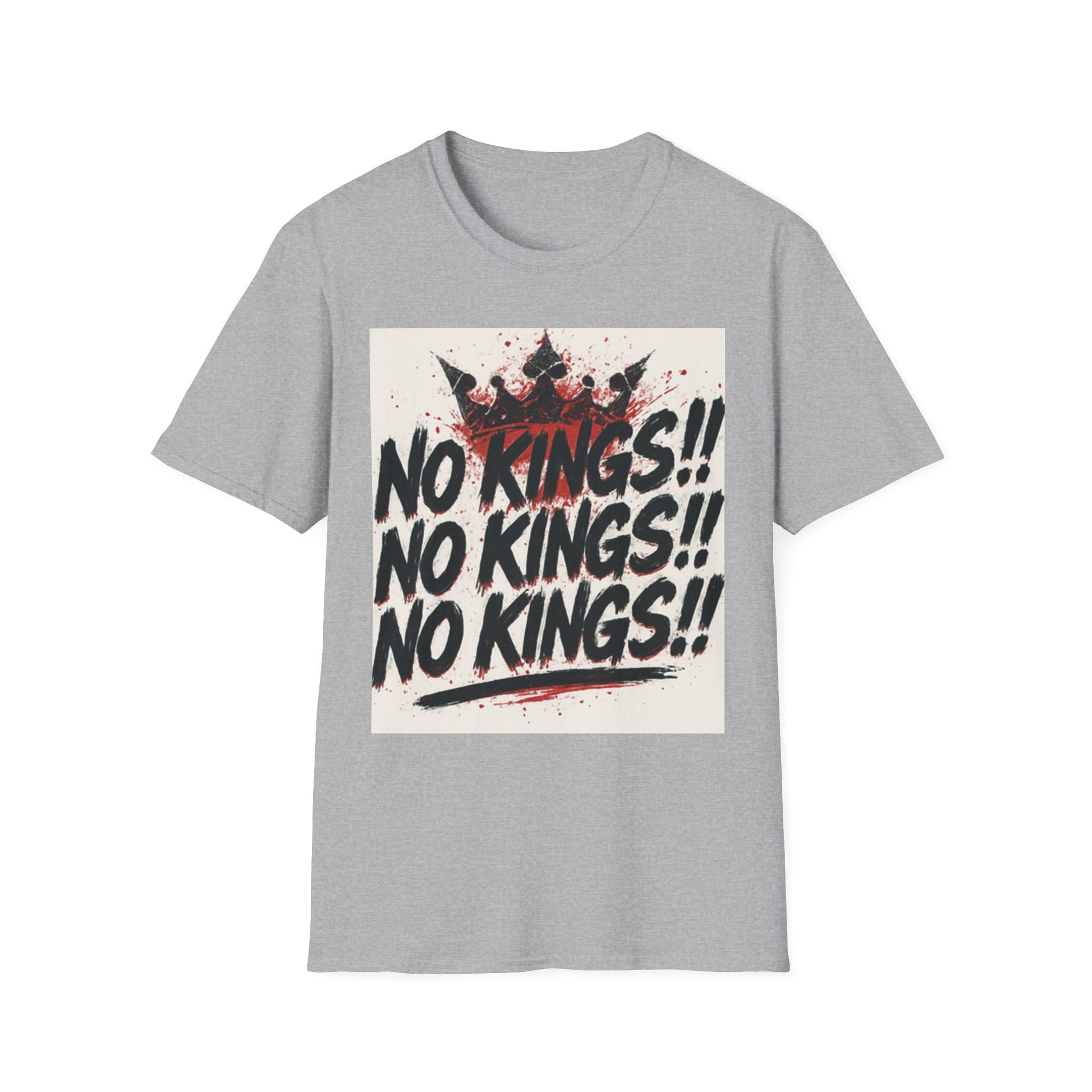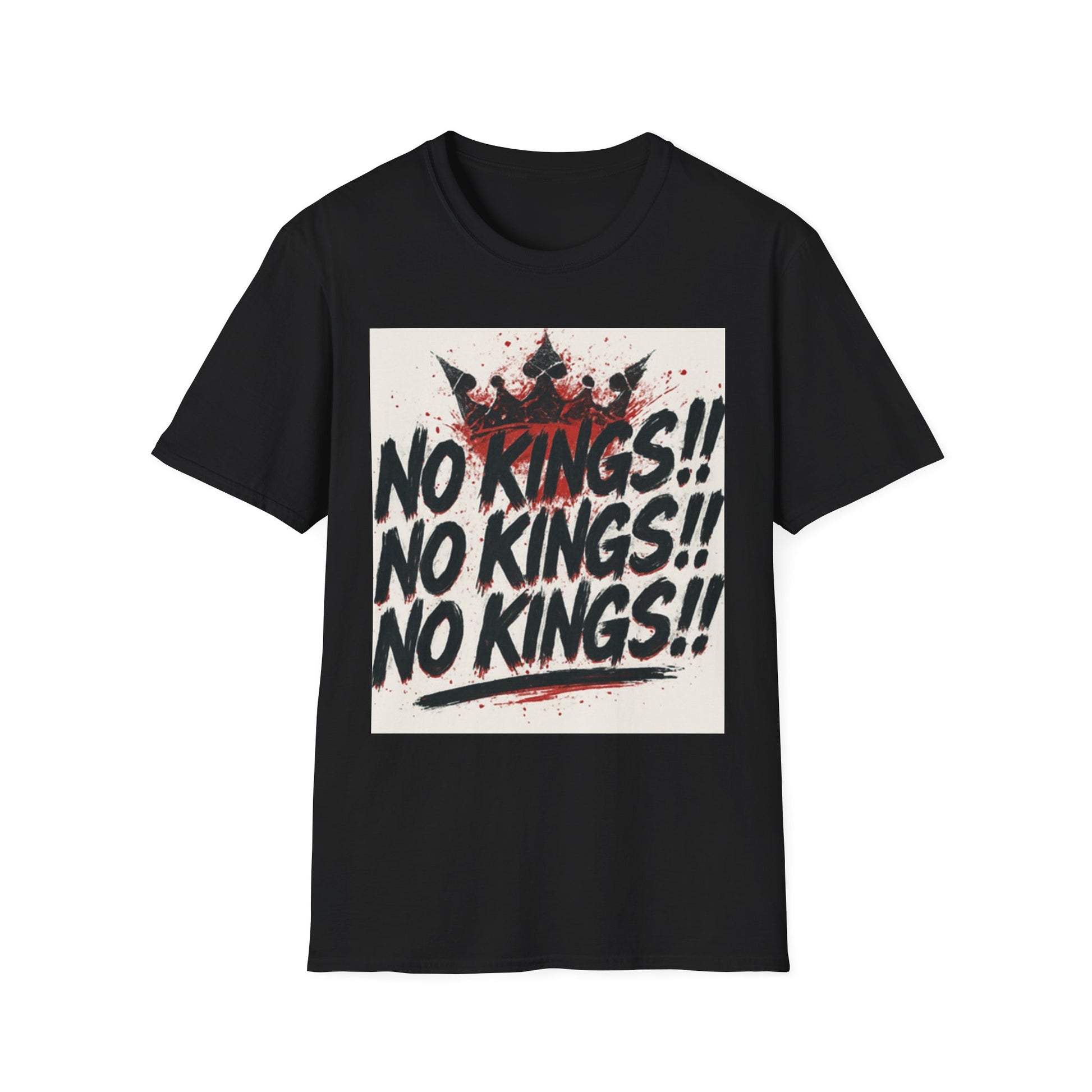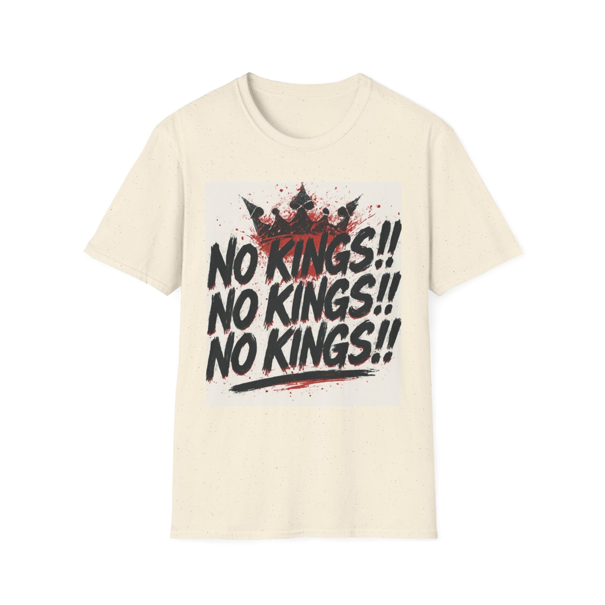 This tee carries a raw, rebellious energy — bold brush-stroke lettering declaring “NO KINGS!!” three times, stamped over a distressed crown and splattered paint. It lands like a shouted manifesto on soft, lightweight cotton. Wear it to shake up a quiet room, to match a streetwise outfit, or to hold up during protests and punk shows. The fit sits clean at the shoulders with a classic crew neck, so the message reads loud without the shirt getting in the way. It’s for people who prefer statement pieces that look lived-in from the first wear and keep their shape through repeat wear. The print’s slightly grungy texture pairs well with denim, layered flannels, and chunky boots — or under a leather jacket when you want something that’s equal parts attitude and everyday comfort.
