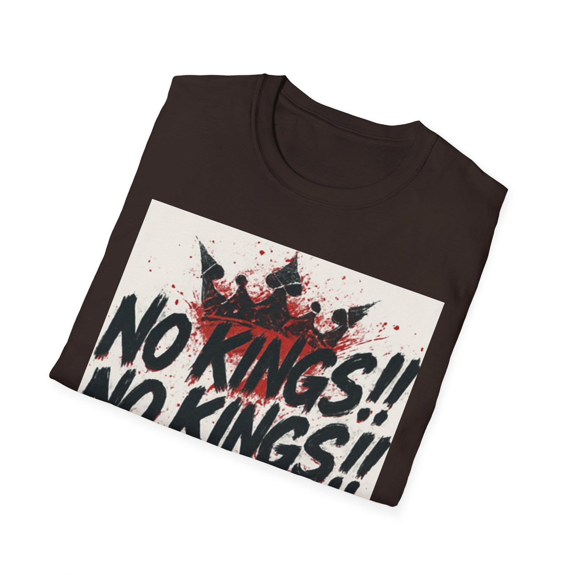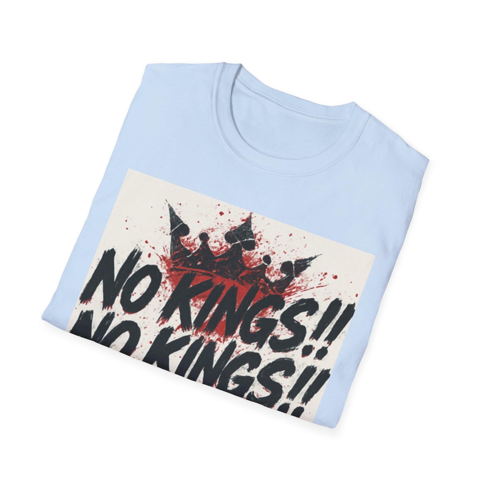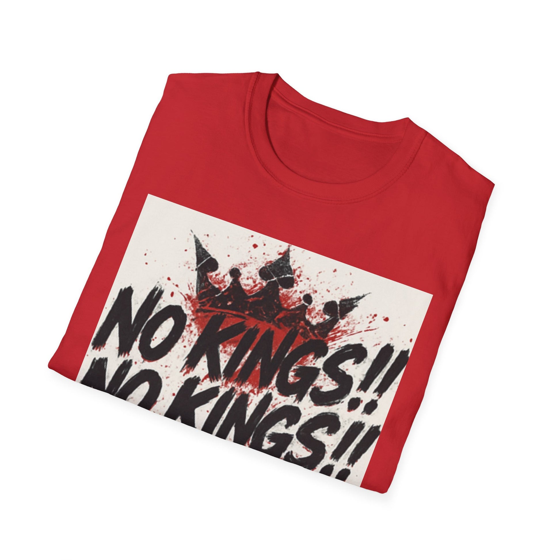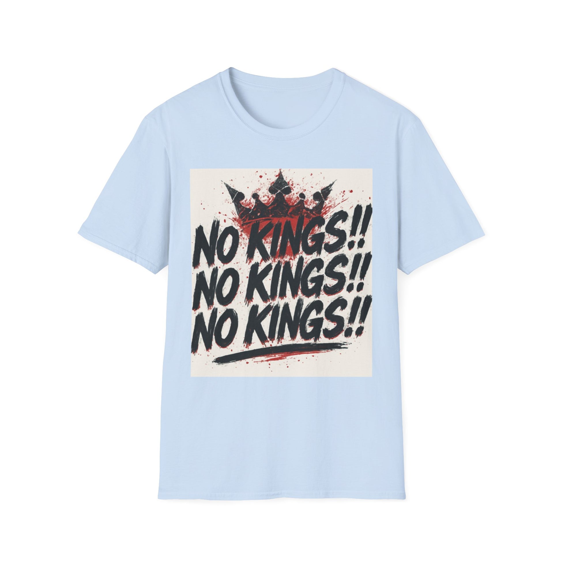 This tee carries a raw, rebellious energy — bold brush-stroke lettering declaring “NO KINGS!!” three times, stamped over a distressed crown and splattered paint. It lands like a shouted manifesto on soft, lightweight cotton. Wear it to shake up a quiet room, to match a streetwise outfit, or to hold up during protests and punk shows. The fit sits clean at the shoulders with a classic crew neck, so the message reads loud without the shirt getting in the way. It’s for people who prefer statement pieces that look lived-in from the first wear and keep their shape through repeat wear. The print’s slightly grungy texture pairs well with denim, layered flannels, and chunky boots — or under a leather jacket when you want something that’s equal parts attitude and everyday comfort.